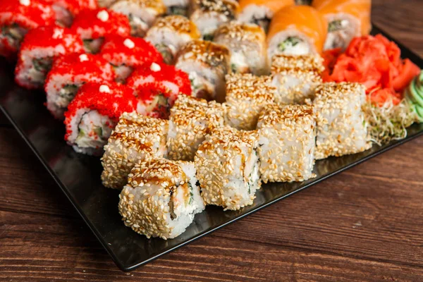 Урамаки суть «роллы наизнанку», где рис снаружи, а нори с начинкой внутри. Диаметр средний, количество начинок как правило две-три. Это может быть крабовое мясо, морские гребешки, тунец, говядина, курица, бамия, огурец, авокадо. Рис обмакивается в жаренные кунжутные семечки или икру.