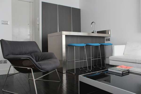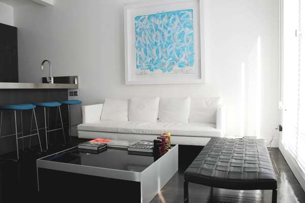 Простір квартири організовано, навколо зони вітальні, яка поєднана з кухнею.Таким чином вийшла модна квартира студія. Всі меблі в цій квартирі розташована в центрі кімнати, і вона чітко виділяється на тлі білих стін.Стиль меблів підкреслять сучасними матеріалами, наприклад, в дизайні кухні використані елементи з нержавіючої сталі.Над диваном, який стоїть біля стіни, красується картина в білій рамці, намальована блакитними фарбами.Поруч з диваном стоїть журнальний столик за яким можна випити чашку кави або почитати улюблений журнал.